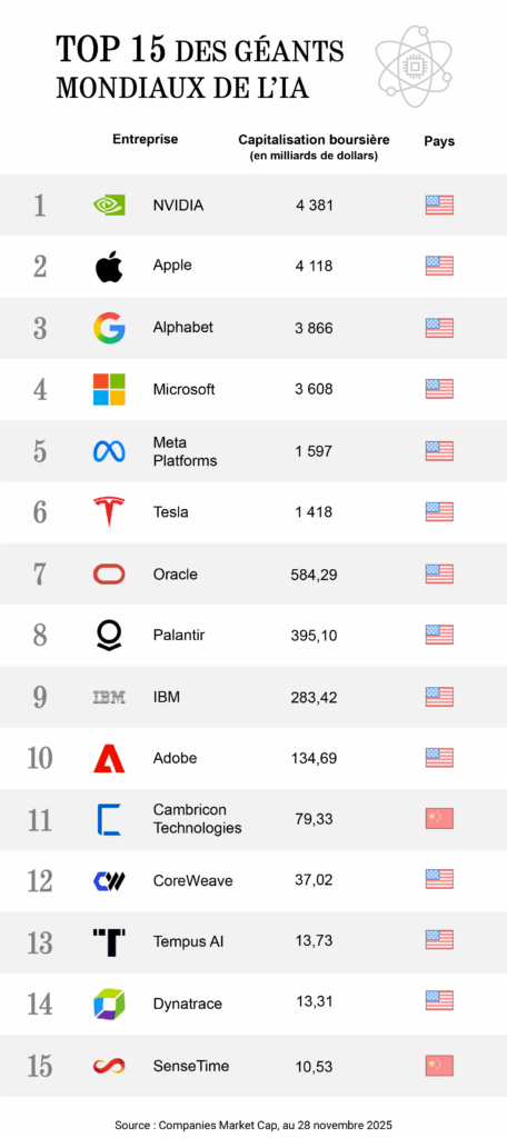 La carte du monde de l’IA se dessine aussi sur le terrain technologique et économique. La compétition entre les États-Unis et la Chine en fournit l’exemple le plus visible. Washington a multiplié les restrictions sur l’exportation de puces de pointe vers Pékin, en particulier les GPU de Nvidia, indispensables à l’entraînement des modèles les plus avancés. Le PDG de Nvidia, Jensen Huang, n’a pas caché son scepticisme face à cette stratégie. Pour lui, l’affirmation selon laquelle la Chine sera incapable de produire ses propres puces d’IA est une illusion.